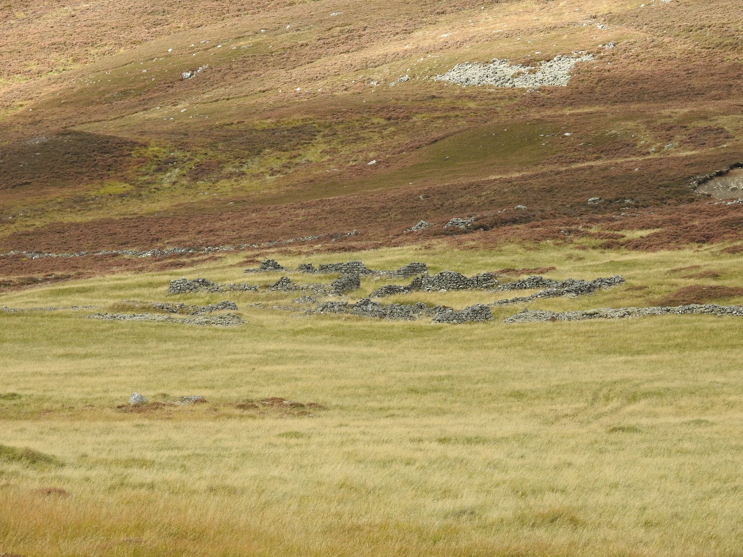 An old, abandoned shieling above the flood plain of the River Dee. These were dry-stone simple buildings and enclosures used to feed cattle in the summer pastures
