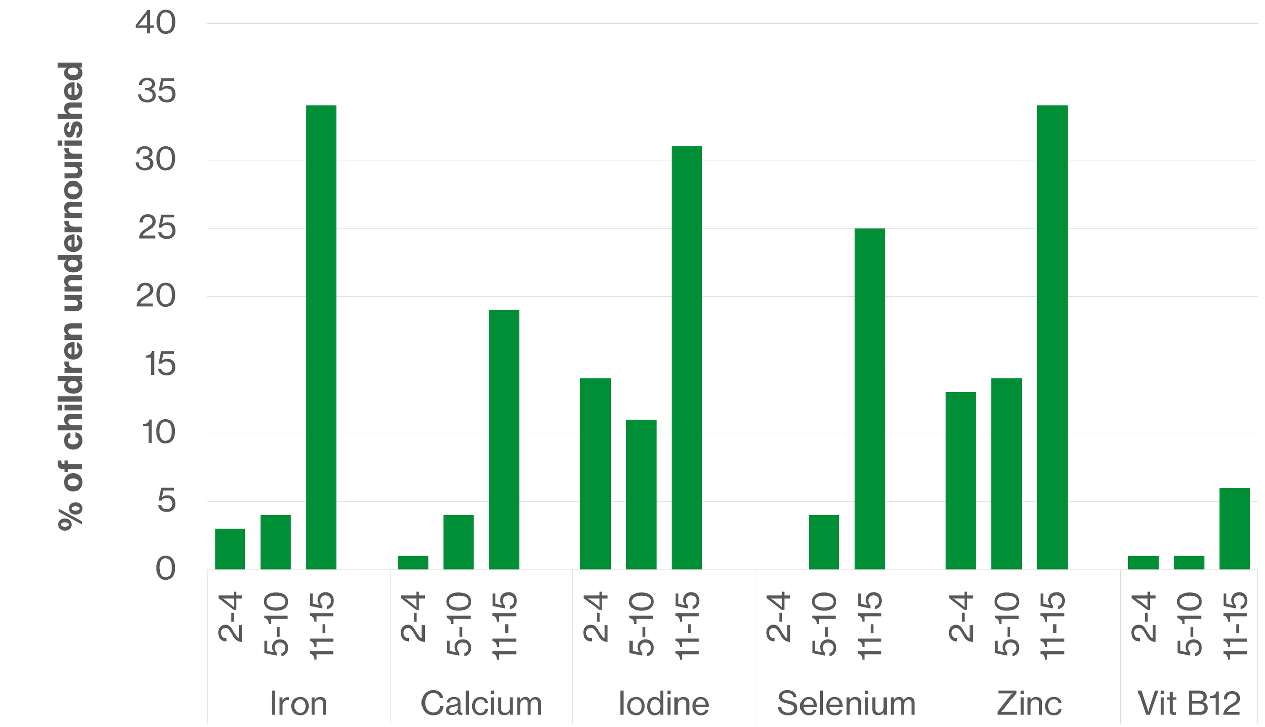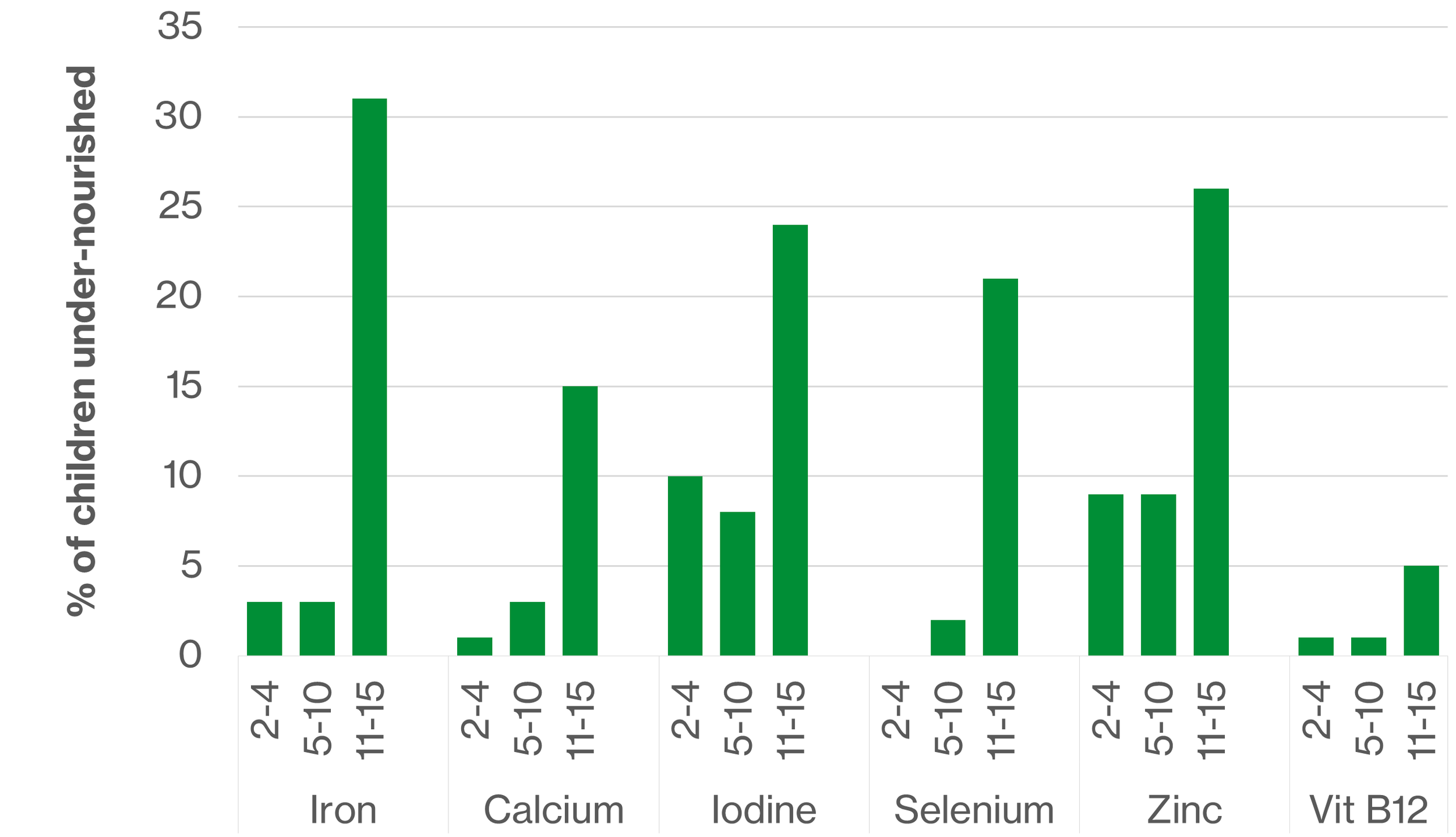 The proportion of Scottish children currently experiencing deficiencies in target micronutrients is presented in Figure 1. Note that data is presented for each micronutrient in three age groups (2-4, 5-10, 11-15).