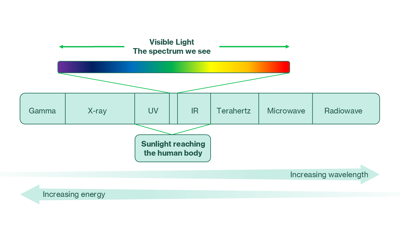 The UV, visible, and IR that reaches us on earth makes its way into the human body to varying degrees (Figure 2).