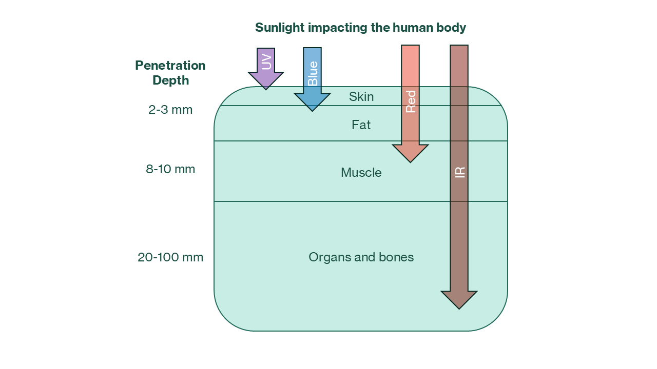 Figure 2: Sunlight enters the human body to varying degrees. UV is very shallow and penetrates only the surface of skin. IR gets deep into human tissues and their mitochondria